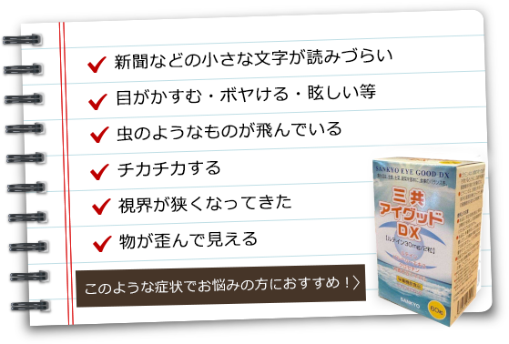 77歳(女性)老眼が進み文字が見にくい。年だからと諦めていた時に娘に勧められ飲み始めました。不思議な事に頭痛がしなくなり肩こりも楽になりました。なんとなく文字も見やすくなってきたような気がします。まだ1か月なので続けてみようと思います。
